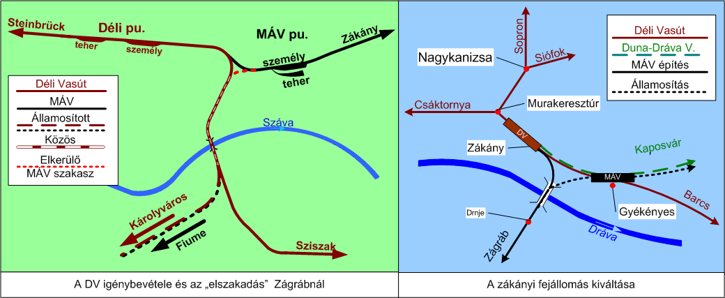 A DV-at, azonban így sem lehetett megkerülni. Ahhoz, hogy Pest-Budáról Fiuméig eljussanak a vonatok a konkurencia vonalán, vonalain is végig kellet pöfögniük: Budáról Nagykanizsára a balaton-parti vonalon, Kanizsáról Zákányig a Wiener Neustadt – Barcs vonalon, majd Zágráb – Károlyváros szakaszon. Ezért az állam még a MÁV két szakaszának 1873-as megnyitása előtt kényszerítette a Déli Vasutat, hogy ez utóbbi, már 1865-ben megépült szárnyvonalát adja el a MÁV-nak. Ezzel a Dráva partot a tengerrel összekötő, 332 km hosszú összefüggő vonal állami kézbe került. Csakhogy a majdnem ugyanilyen hosszú dunántúli szakasz, Budától Zákányig még mindig osztrák kézben, a DV tulajdonában volt. Ezeket a vonalakat azonban nem lehetett megszerezmi, hiszen egyrészt a Burg a Rotschild bankháznak elkötelezettje volt, másrészt e vonalak az osztrák területek hálózatához kapcsolódtak. Nem maradt más lehetőség, mint új útvonalon kerülni el a konkurenciát.