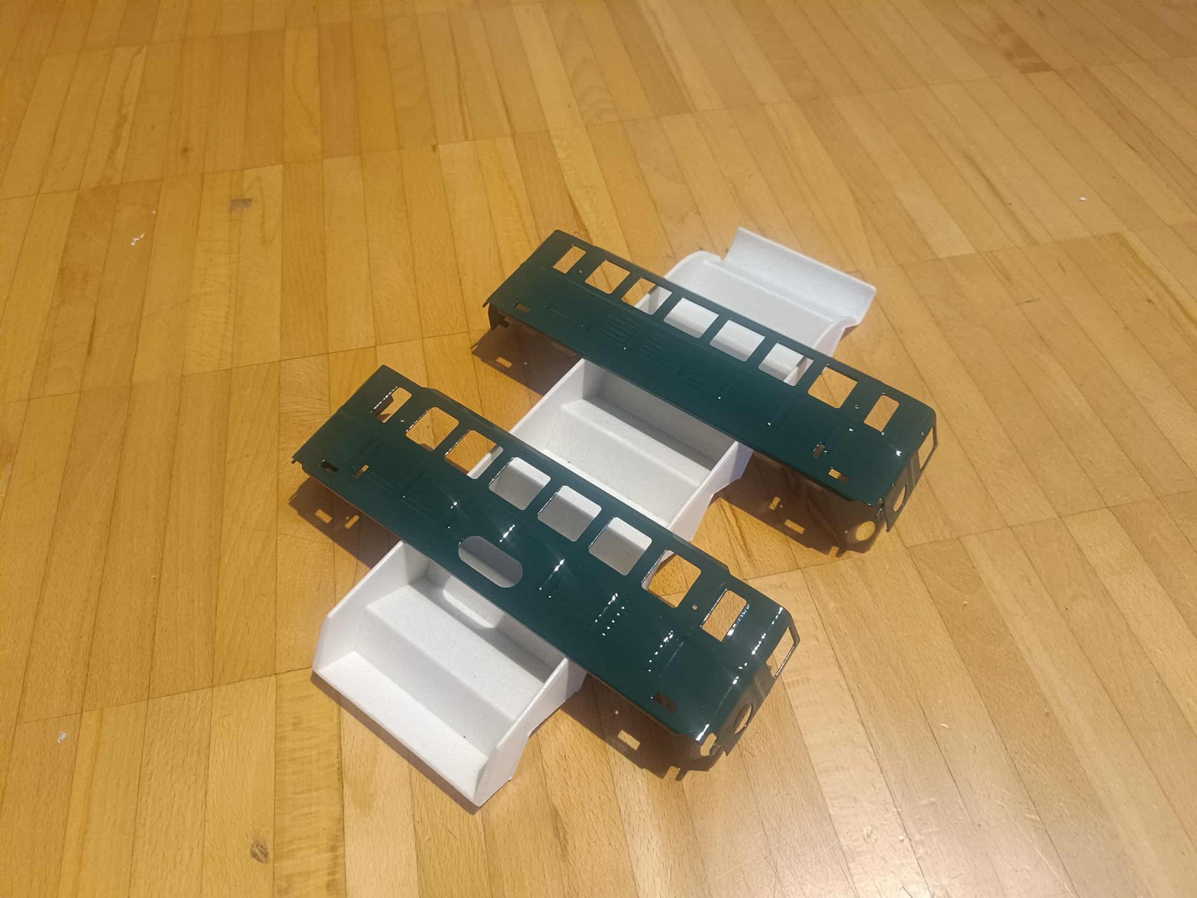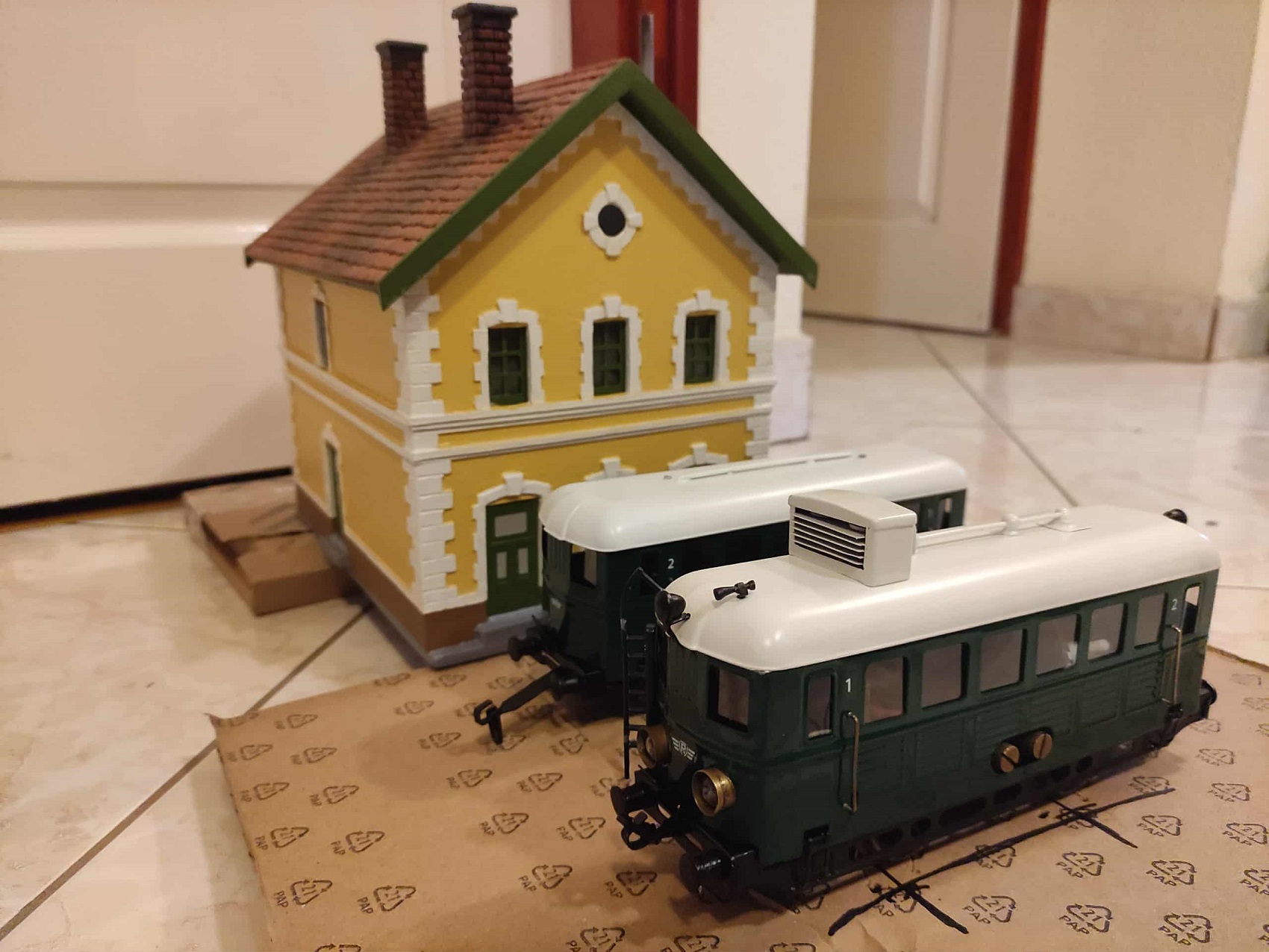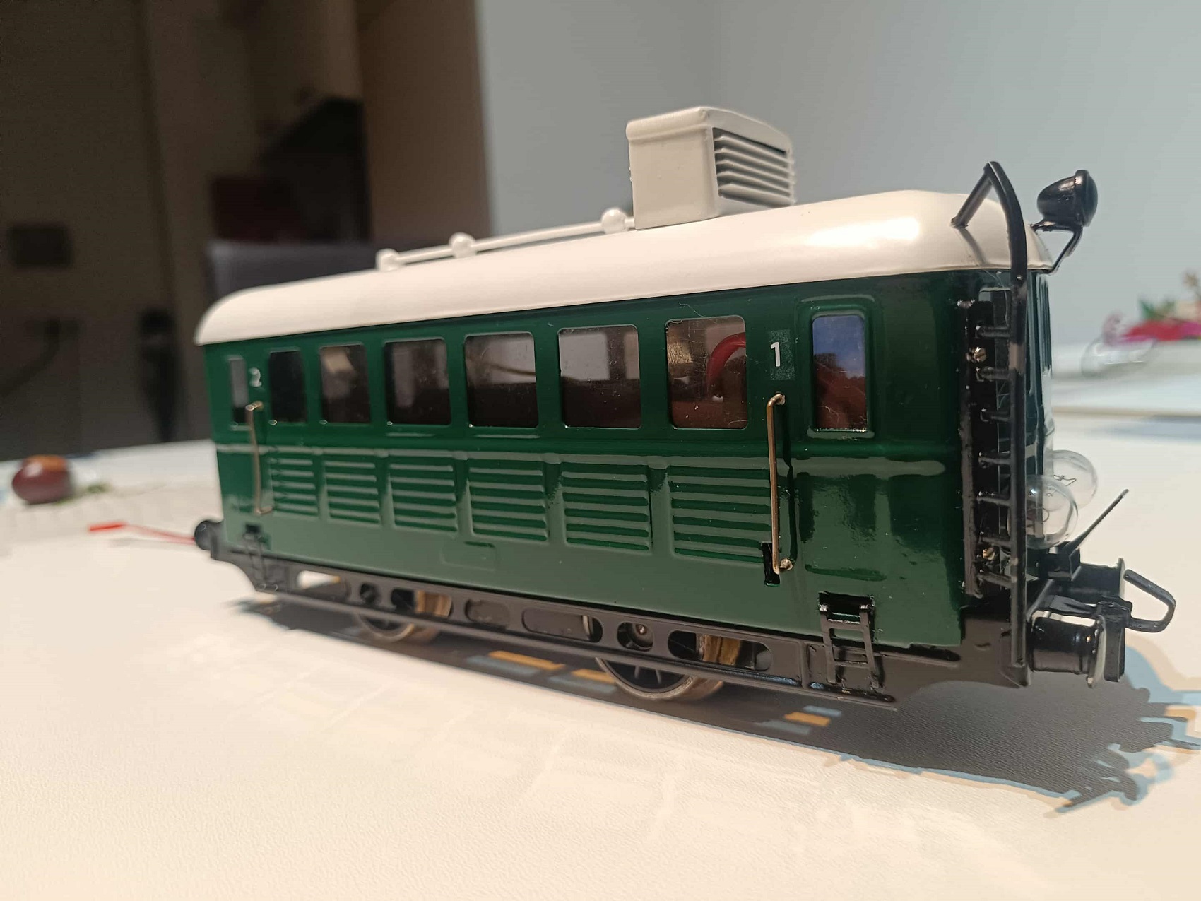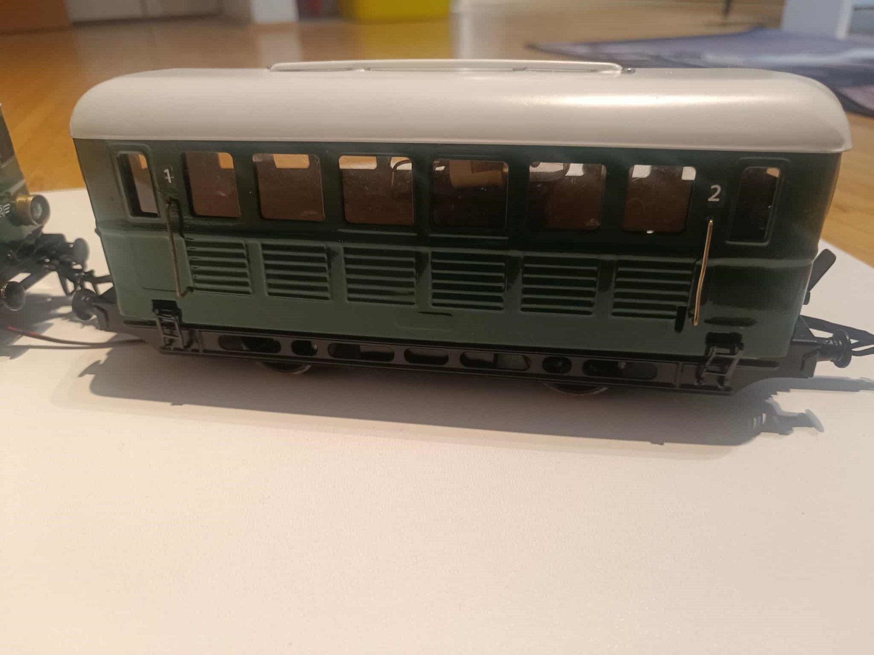 Zoli azonban nem kicsit csavart a töréneten! Először is, direkt úgy fotózta a dolgot, hogy ne lássam jó ideig, de csak elkészült a létra is a tetőre, valamint további becses apróságok, mint pl. a fekete platform, az ütközők között. Amire azonban végképp nem számítottam, hogy nem véletlen volt szétkapva két PV Előre mozdony a kezdetekben… Elkészült ugyanis egy szabványos Bzx 2428-100-as pályaszámsorozatú mellékkocsi is, avagy leánykori nevén 1974 előttről: ABx 44 000. Erre már végképp nem tudtam mit mondani, a köszönömön kívül.