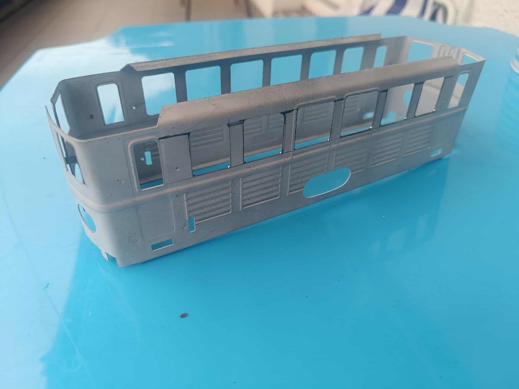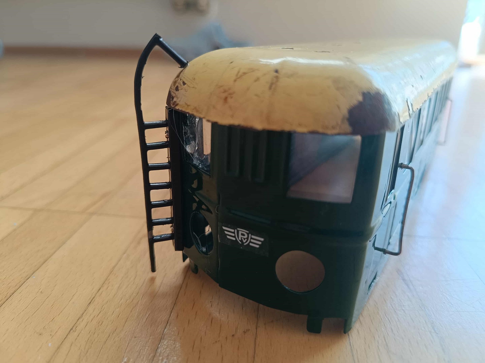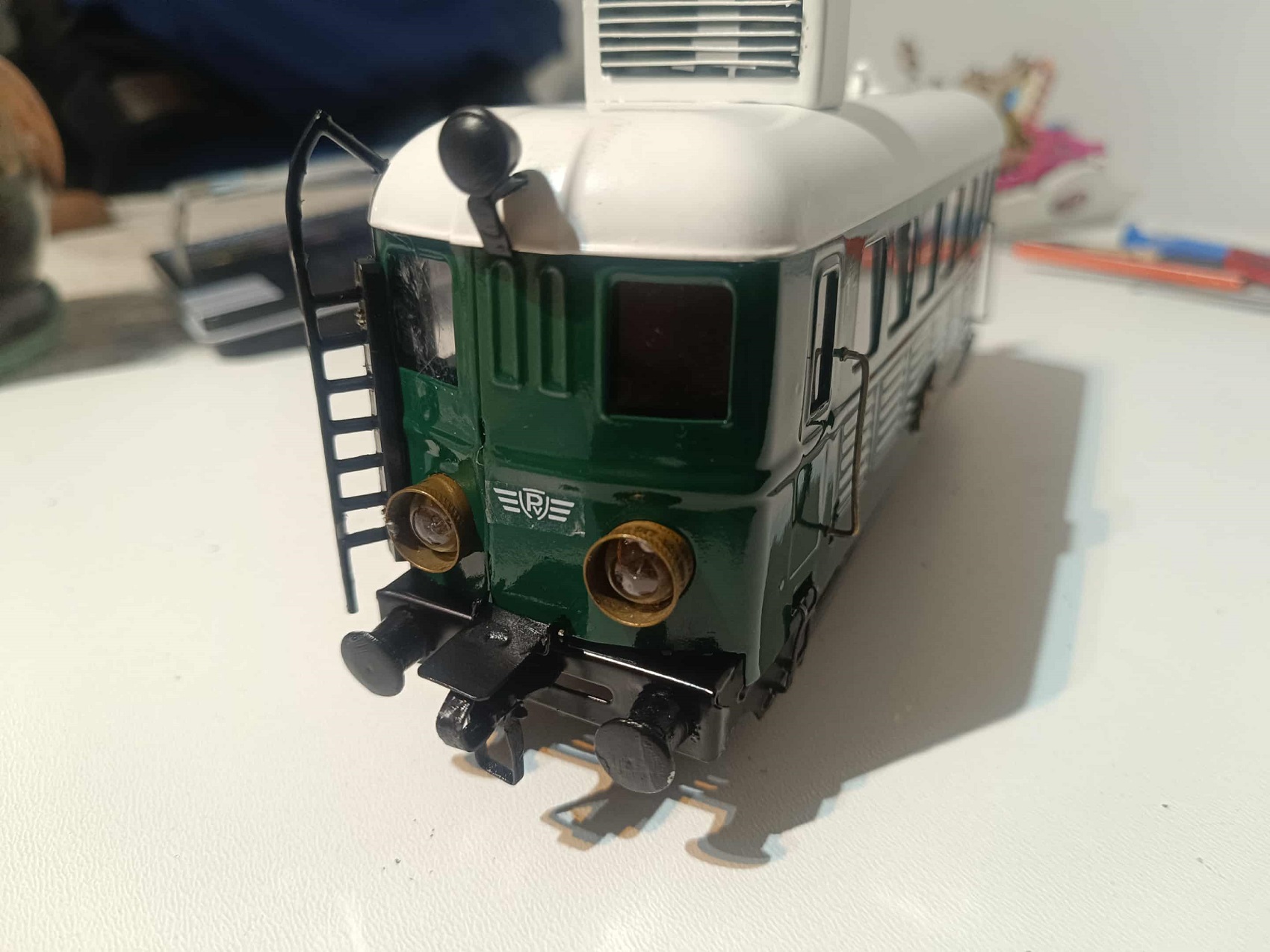 A homokszórás csodát tett, és bevallom, még sosem láttam ilyen tisztán a részleteit egy ilyen mozdonynak. Ekkor már ment a matek is, hogy mekkora legyen a „Frigyláda” a tetején, hogy nézzen ki, stb. Utána következett a talán legérzékenyebb rész: kézzel kivágni és reszelgetni az ablakokat. Ettől bevallottan mindketten tartottunk, én azért, hogy utána esetleg nyeklik-nyaklik majd, merevebb test híján. Ő meg azért, mert mégis kézműves módon készült, és nehogy megremegjen a keze, és legyen elég reszelő! Szerencsére meg se kottyant neki, sőt, nyilván súlyt is csökkentettünk, így lehet, ez most a valaha volt leggyorsabb PV is. Na, nyilván nem, mert a teteje rendesen meg lett „szórva” a motorkocsinak dudával, keresőlámpával, na meg magával a csodálatos hűtőszerkezettel. Én naiv, azt hittem, itt a vége, hamarosan küldi Zoli távolból a dolgot, és épp időben odaér a barcsi kiállításra, a Dráva Múzeumba.