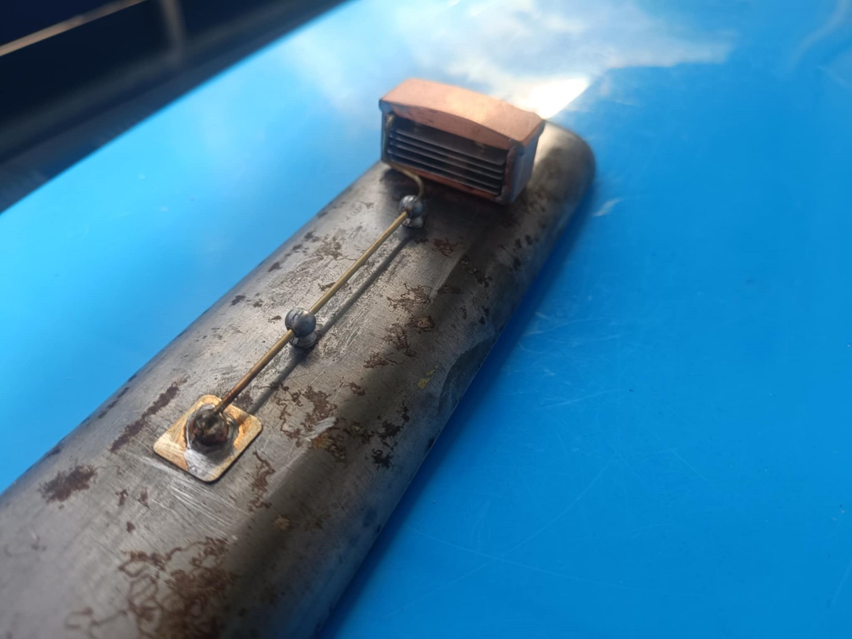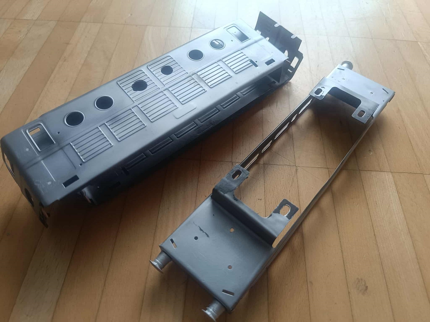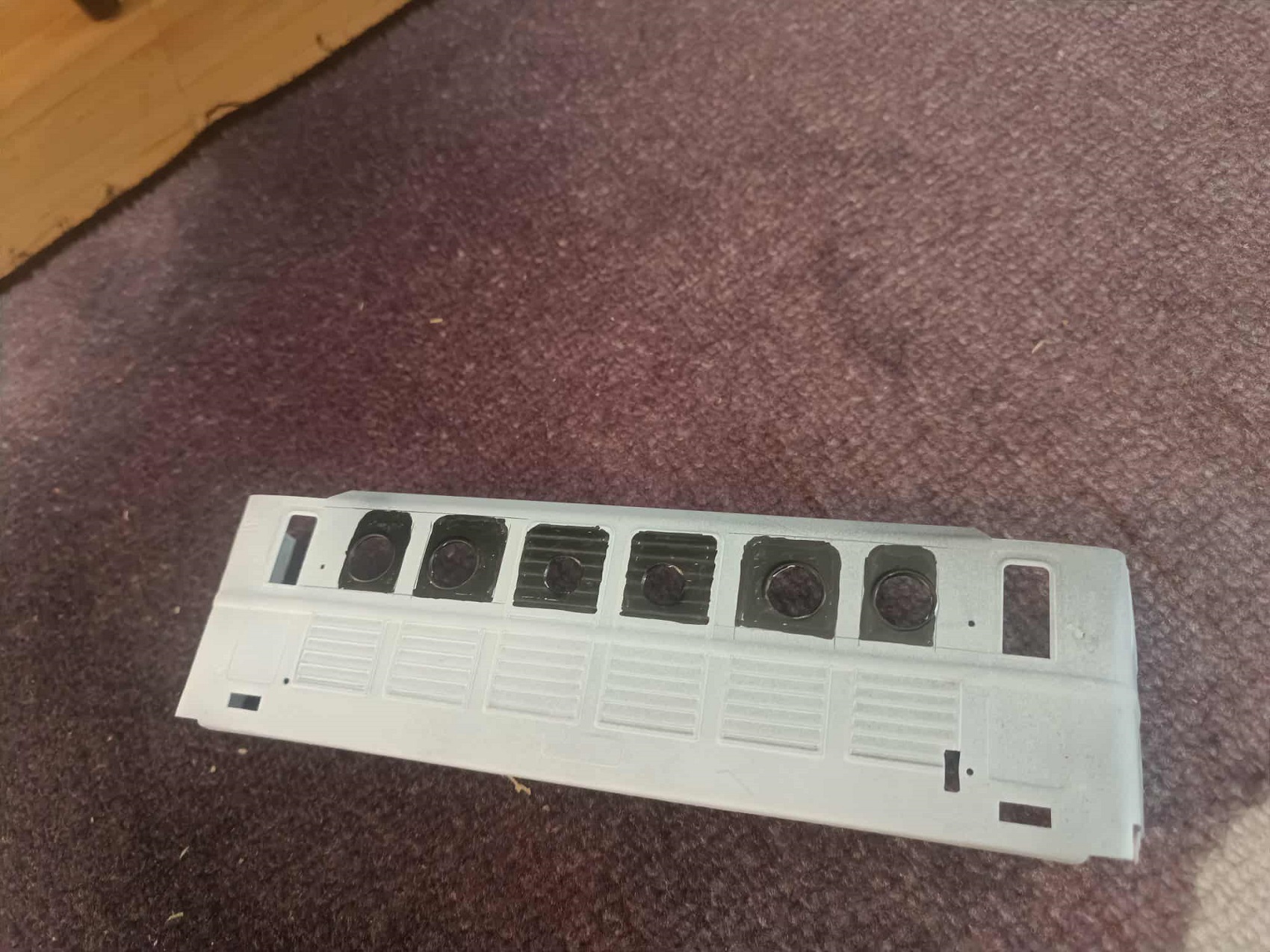 A homokszórás csodát tett, és bevallom, még sosem láttam ilyen tisztán a részleteit egy ilyen mozdonynak. Ekkor már ment a matek is, hogy mekkora legyen a „Frigyláda” a tetején, hogy nézzen ki, stb. Utána következett a talán legérzékenyebb rész: kézzel kivágni és reszelgetni az ablakokat. Ettől bevallottan mindketten tartottunk, én azért, hogy utána esetleg nyeklik-nyaklik majd, merevebb test híján. Ő meg azért, mert mégis kézműves módon készült, és nehogy megremegjen a keze, és legyen elég reszelő! Szerencsére meg se kottyant neki, sőt, nyilván súlyt is csökkentettünk, így lehet, ez most a valaha volt leggyorsabb PV is. Na, nyilván nem, mert a teteje rendesen meg lett „szórva” a motorkocsinak dudával, keresőlámpával, na meg magával a csodálatos hűtőszerkezettel. Én naiv, azt hittem, itt a vége, hamarosan küldi Zoli távolból a dolgot, és épp időben odaér a barcsi kiállításra, a Dráva Múzeumba.