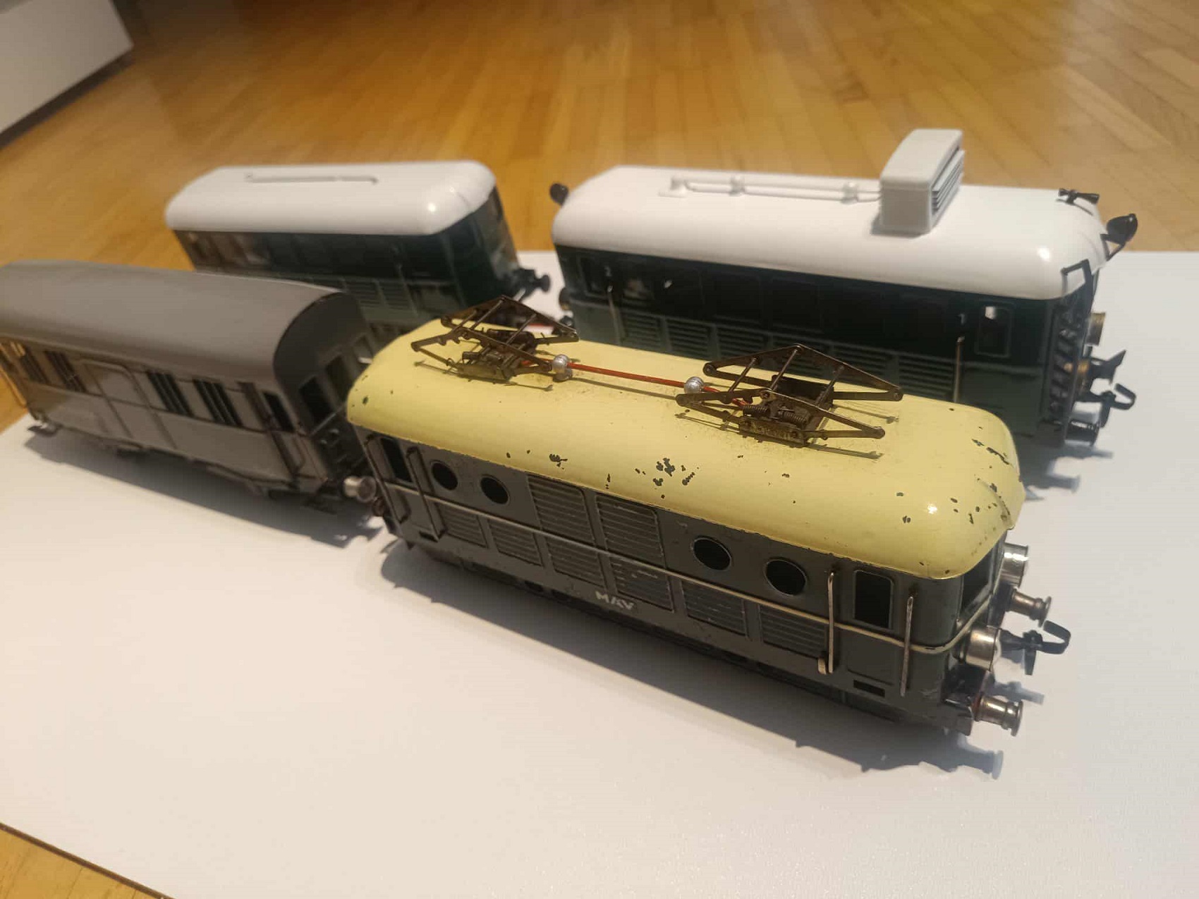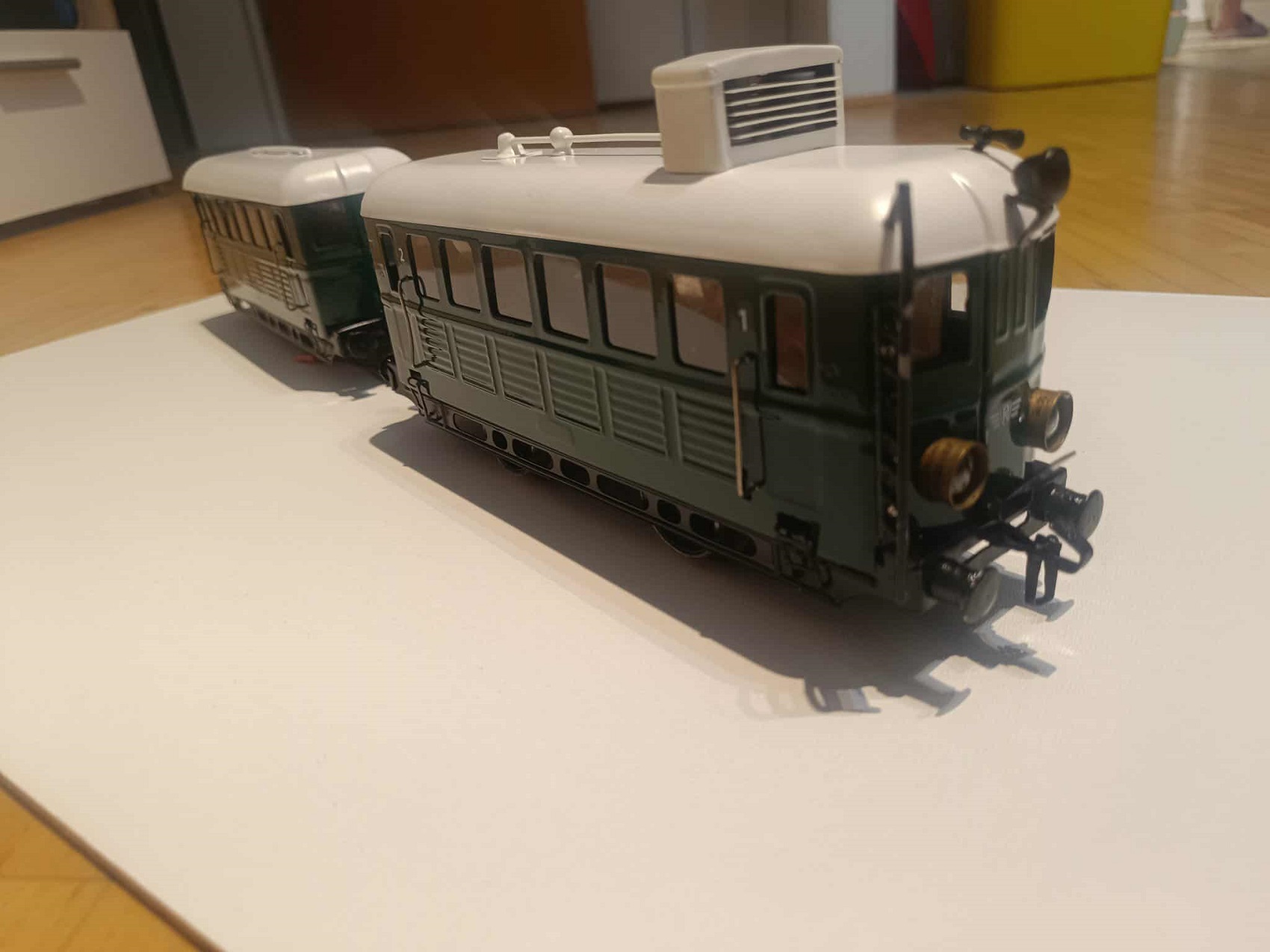 Onnan indult a dolog, hogy megszereztem a jellegrajzát egy AB motorkocsinak. Aztán viccből egy mellékkocsinak is, mert akkor pont pörögtem azon, hogy volna egy eladó, 1:1-es méretarányú. Sajnos, azt nem sikerült megmenteni, szétvágták. Egy gyors hevenyészett digitális rajzot adtam aztán a mesternek, meg tenger sok képet ABmotokról az ország minden szegletéből, így a 400-ast is, amely Nagyatádon alussza álmát, viszont legalább jelenleg szép állapotban van. A kis villanymozdony viszont eléggé játszott volt, és nem megfelelően tárolt, tehát innen indultunk.