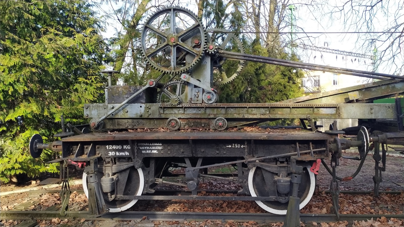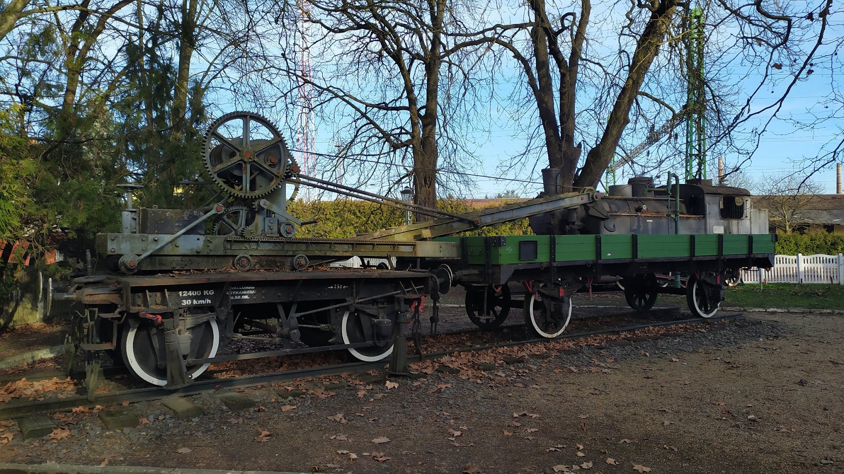 A vasúti pályák építésében és karbantartásában nélkülözhetetlen szerepet játszott a darus ellensúlykocsi is. Ez a kézi mozgatású, csigás emelőszerkezettel felszerelt jármű lehetővé tette a nehéz vasúti elemek – például sínek vagy váltók – precíz és biztonságos mozgatását. A parkban található darus kocsi emlékeztet arra, hogy a vasút működése nemcsak a mozdonyok és kocsik teljesítményén, hanem a pályafenntartók szorgos munkáján is alapult.