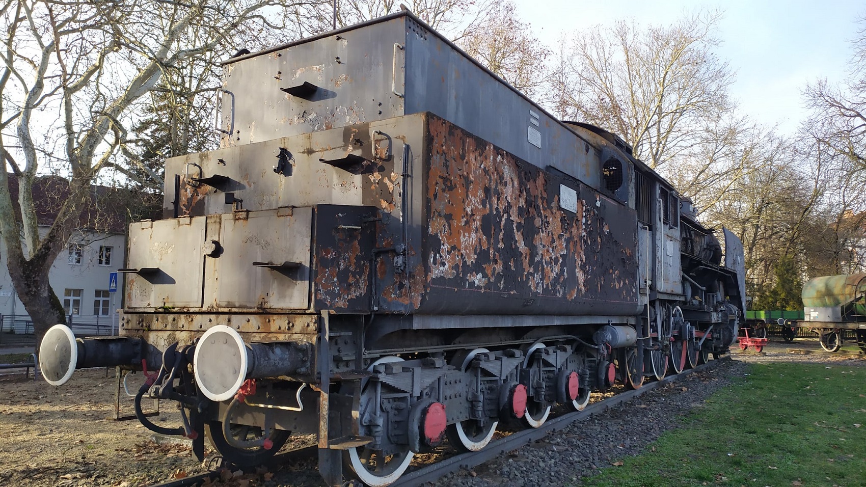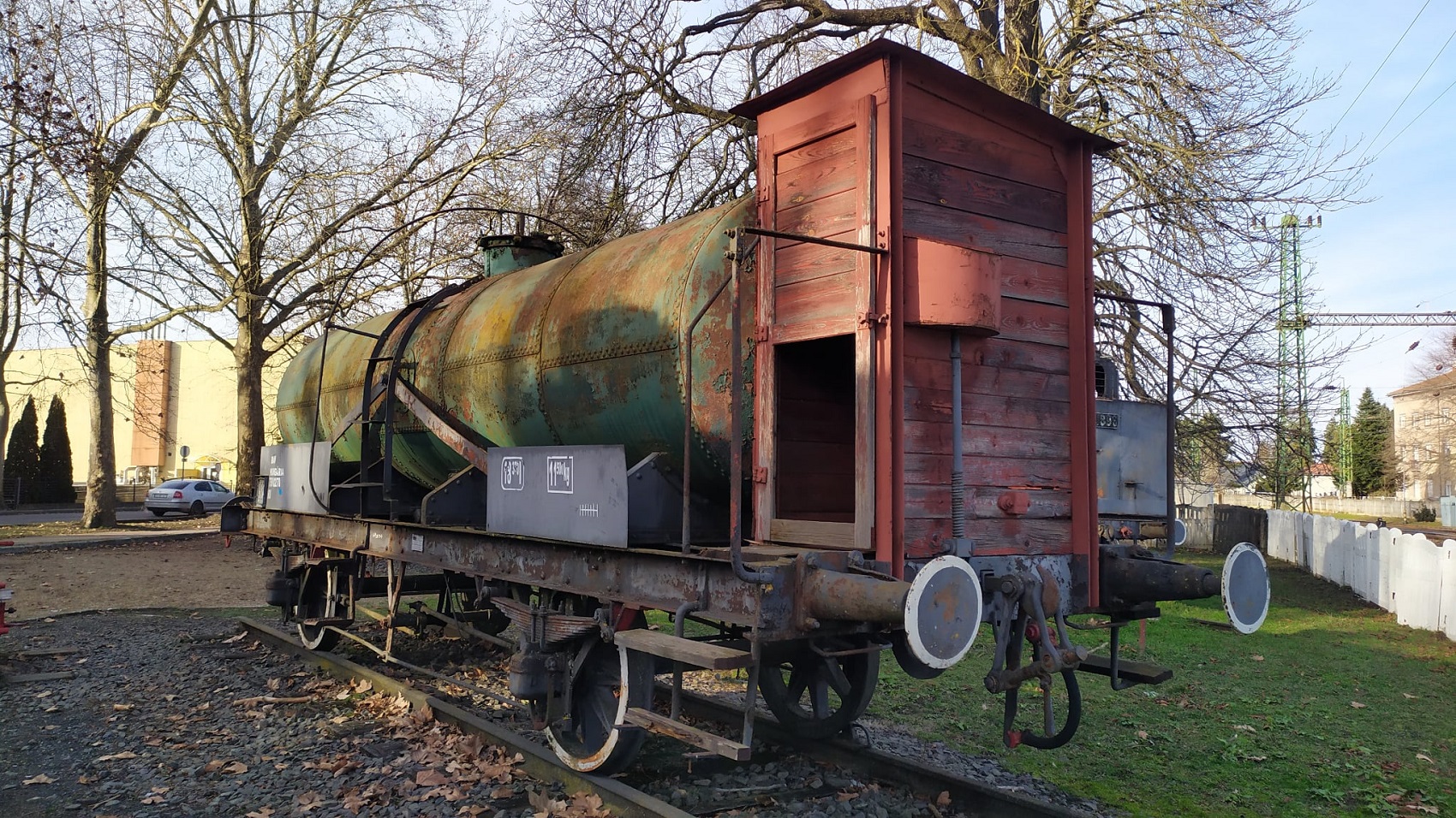 A park egyik különleges darabja a két tengelyes, 12 tonnás petroléum-szállító tartálykocsi, amely 1892-ben készült Budapesten, a Ganz és Társa Vasúti Kocsigyárban. A szegecselt acéllemezekből épített tartály a petróleum és más olajipari termékek biztonságos szállítását szolgálta. Érdekessége a jármű végén kialakított fékállás, ahol a fékező a kéziféket kezelte; a hosszú tehervonatoknál gyakran több fékező is dolgozott egyszerre, hogy a szerelvény lassításában és megállításában segítsenek.